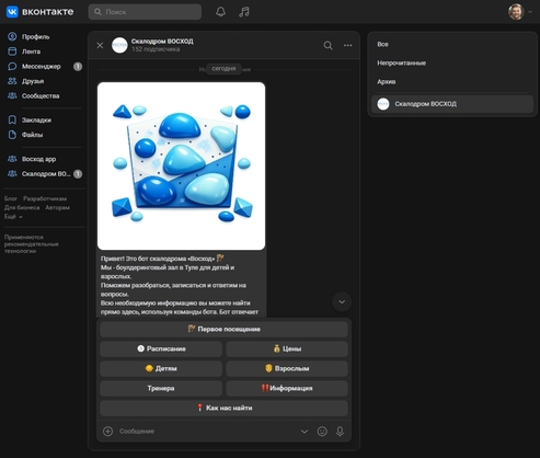 Создание бота для группы ВКонтакте оказалось гораздо более масштабной задачей, чем просто «написать несколько команд». Основная цель - предоставить посетителям скалодрома «Восход» быстрый доступ к информации и сделать первый контакт с залом максимально простым. Бот работает круглосуточно, выполняя роль виртуального сотрудника поддержки, который всегда готов ответить на основные вопросы.